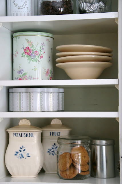 Skall nog drömma lite till om det där köket jag vill ha. Sist jag skulle vila började jag röja lite i köket. Vips så åkte en av skåpsdörrarna av och så var jag igång och "möblerade om". Om jag bara var en lite mer ordningssam person skulle det faktiskt vara fint med öppna hyllor i köket... Och tänk vad mycket som skulle rensas ut. Just nu känns det lite som om jag bara dönar in allt i skåpen och stänger dörren för att slippa tänka på det. Min rensning i köket resulterade i alla fall i en kartong som skall upp på vinden. Dörren lär åka på igen, det är ganska fula stommar på vårt kök och hål och beslag gör ju inte det hela snyggare, men man får i alla fall en liten känsla av att prova på.
